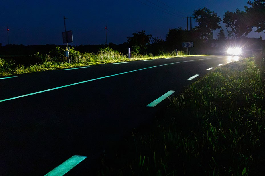 Our LuminoKrom® photoluminescent paint was chosen to make the road between Châteaubriant and Soudan, in the Pays de la Loire region, safer. By capturing daylight and releasing it at night, our innovation provides optimum visibility for road users, without the need for street lighting. This environmentally-friendly solution is part of a drive to reduce our energy footprint, while improving the safety of road infrastructures, particularly in rural areas which are often poorly lit.