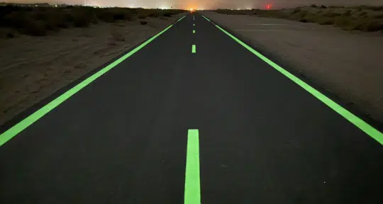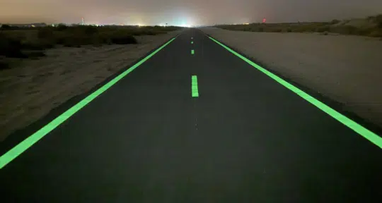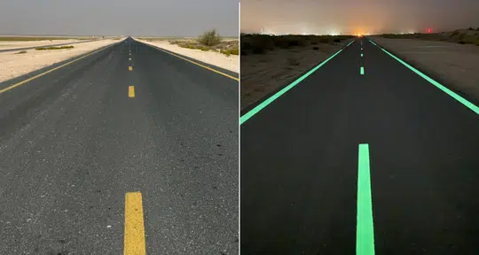 Dans un contexte climatique exigeant comme celui des Émirats Arabes Unis, notre peinture photoluminescente LuminoKrom® constitue une réponse efficace pour améliorer la sécurité des mobilités douces tout en limitant le recours à l’éclairage artificiel. Nos marquages absorbent l’intensité lumineuse du jour, très élevée sous ces latitudes, pour restituer la nuit une lueur claire et continue qui guide naturellement les cyclistes. Cette autonomie lumineuse permet de réduire les besoins en infrastructures électriques, de préserver l’environnement nocturne et d’offrir un haut niveau de confort visuel aux usagers.